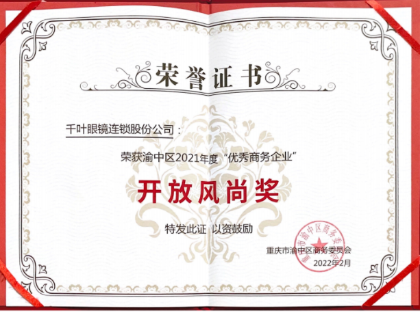 千葉眼鏡榮獲渝中區(qū)2021年度優(yōu)秀商務(wù)企業(yè)“開放風(fēng)尚獎”